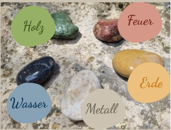 Mit den 5 Wandlungsphasen: Holz - Feuer - Erde - Metall - Wasser lassen sich Prozesse und Phasen des Lebens im Innen wie im Aussen erklären. Die Chinesen haben erkannt, dass die Natur im Aussen eine Entsprechung IN unserem Körper findet. Ein paar Beispiele dazu: Das Entstehen und Vergehen einer Pflanze, die Reifung und Umsetzung einer Idee, das Wechselspiel von Gesundheit und Krankheit. Die 5 Elemente am Beispiel der Jahreszeiten: